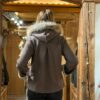 Cape aus Wolle und Alpaka mit ausgestelltem Schnitt und weiten, übergroßen Ärmeln. Erhältlich mit extra großer Kapuze, wahlweise mit oder ohne Waschbärfellbesatz, zwei großen Taschen mit verdeckten Reißverschlüssen und Satinfutter innen. Ein sehr elegantes Kleidungsstück, ideal für jede Jahreszeit: geräuscharm, federleicht, platzsparend und mit hervorragender, natürlicher Wärme für die Übergangszeit und den Winter. Erhältlich in Braun in den Größen S/M und L/XL.
